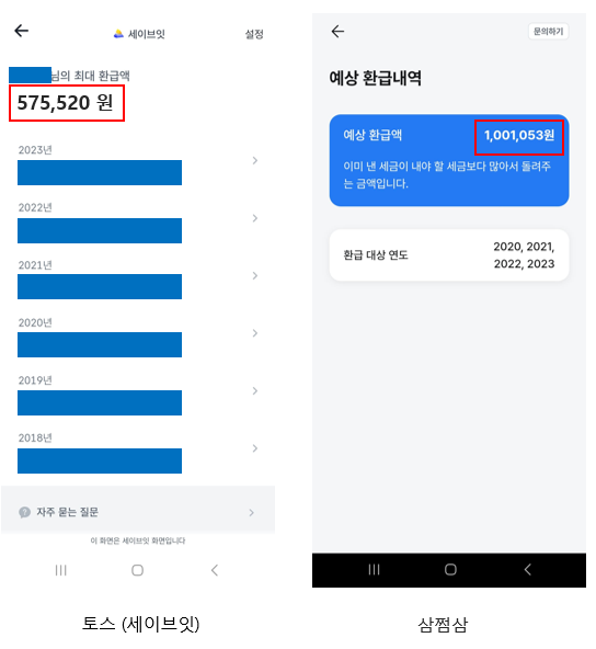 ● 토스(세이브잇) vs 삼쩜삼 금액비교