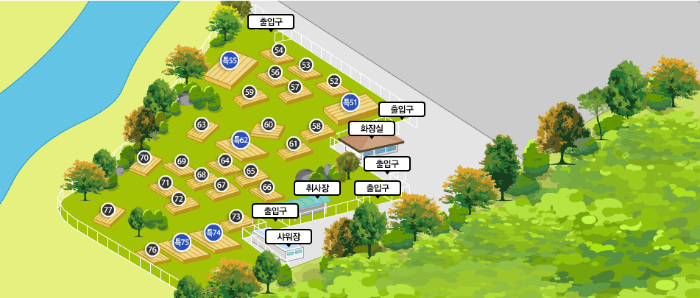 캠핑데크, 주차장, 취사장, 화장실,